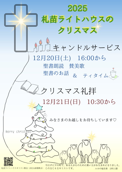 | † 新着情報† 12月20日(土) 午後4時より、 「キャンドルサービス」 を行います。 12月21日(日) 午前10時30分より、 「クリスマス礼拝」 を行います。 どなたでもご参加できますので、ぜひおいでください。 2025年12月14日・・・「礼拝メッセージ2025」に 12/14のメッセージ「永遠のいのちを受け継ぐには」をアップロードしました。 † お知らせ† 教会のゆうちょ口座のご案内です。 |
